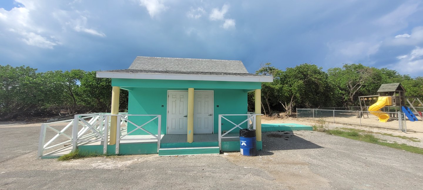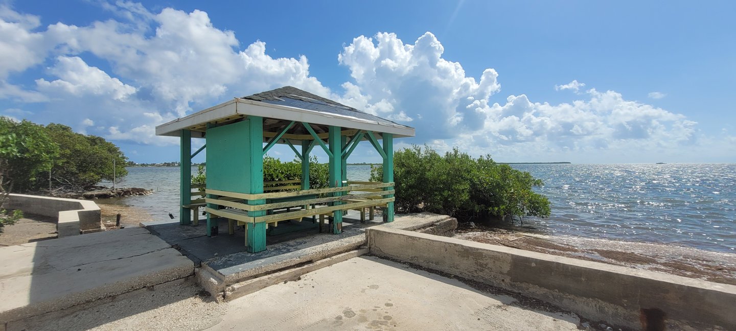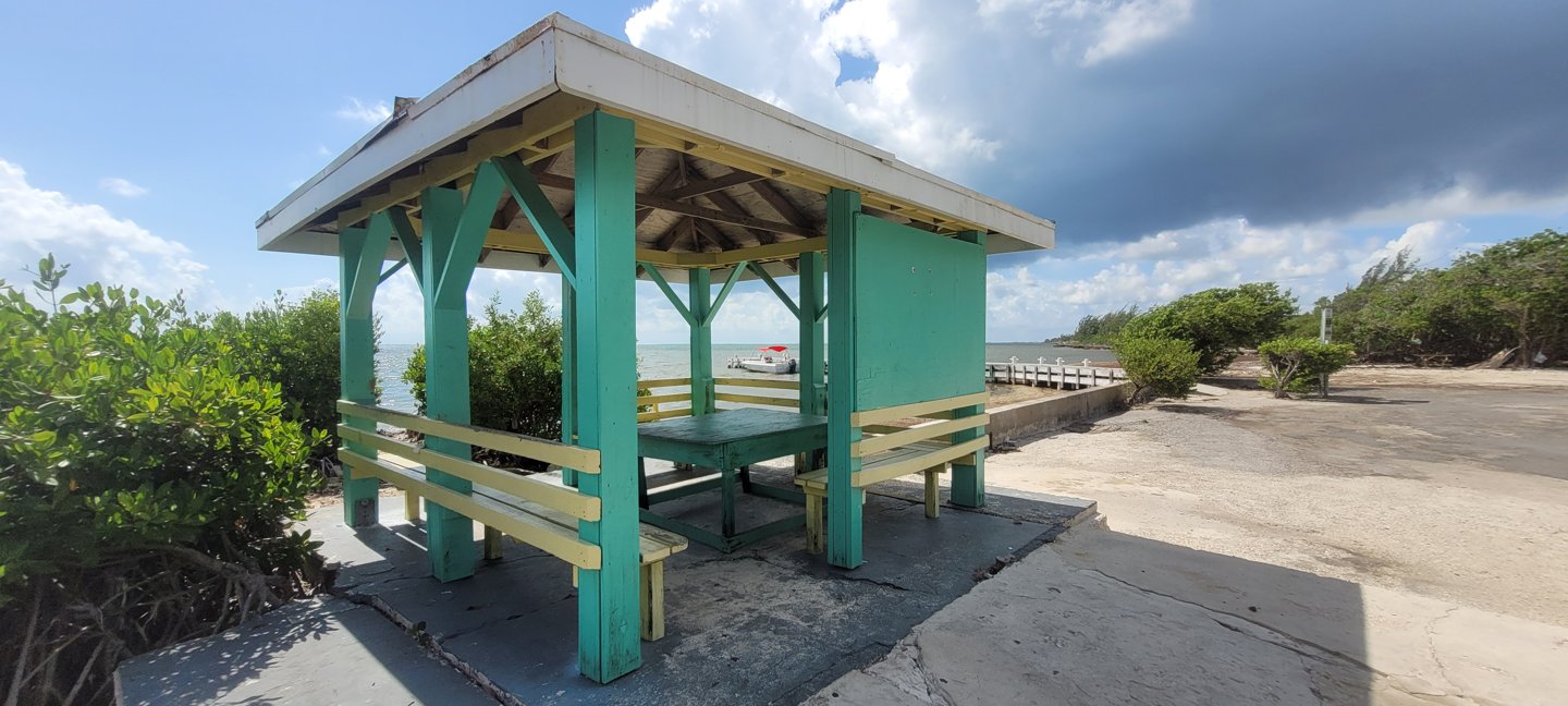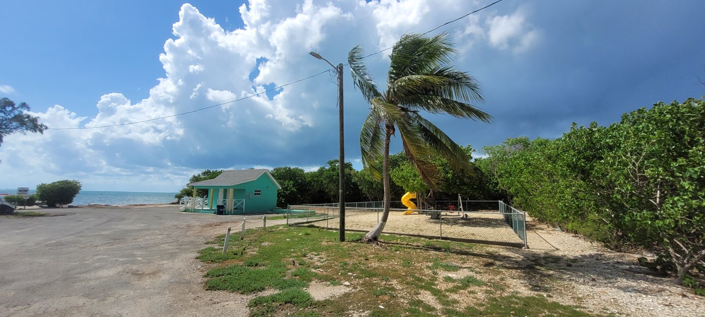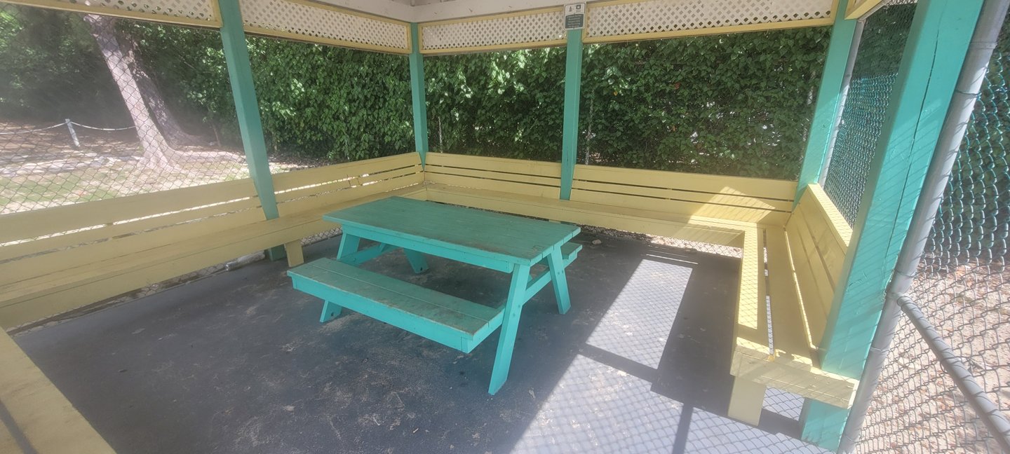 Plenty parking, Shade, trees, Covered Cabanas with Picnic Tables, Bring food and drink, Public Restroom Facilities, very close to Saltwater. Building may provide shelter, but check for access to power and noise from the playground.